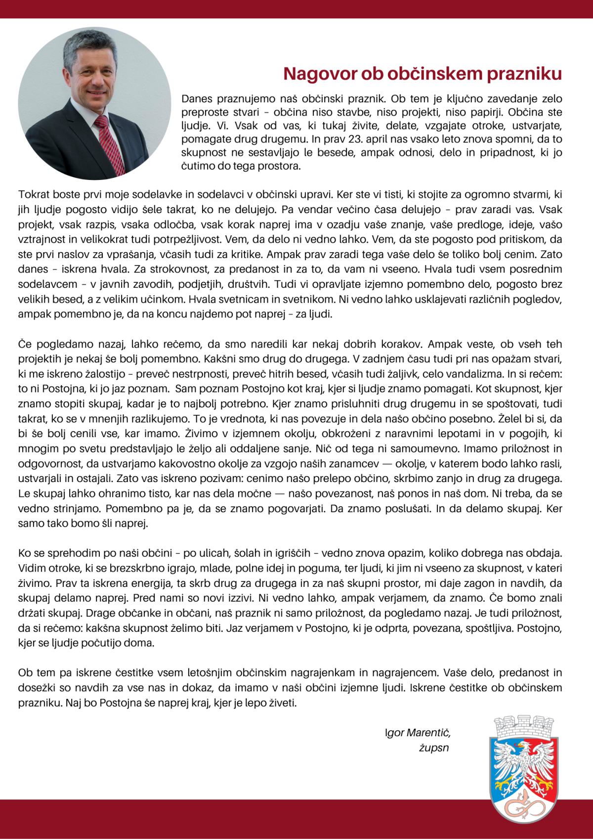 Osrednji nagovor je imel župan Igor Marentič, ki je izpostavil bistvo občine: »Občina niso stavbe, niso projekti, niso papirji. Občina ste ljudje. Vi.« Poudaril je, da skupnost ne gradijo besede, temveč odnosi, delo in pripadnost prostoru, ter spomnil na pomen 23. aprila, ki vsako leto znova opominja na pogum in povezanost prednikov. Ob tem se je zahvalil sodelavcem občinske uprave, javnim zavodom, društvom in vsem, ki s svojim delom soustvarjajo občino. Dotaknil se je tudi sodobnih izzivov: »Pomembno je, kakšni smo drug do drugega. Želel bi si, da bi še bolj cenili vse, kar imamo, in da bi znali ohraniti spoštovanje, tudi ko se ne strinjamo.« Občane je pozval k odgovornosti in povezovanju: »Pomembno je, da se znamo pogovarjati. Da znamo poslušati. In da delamo skupaj. Ker samo tako bomo šli naprej.«