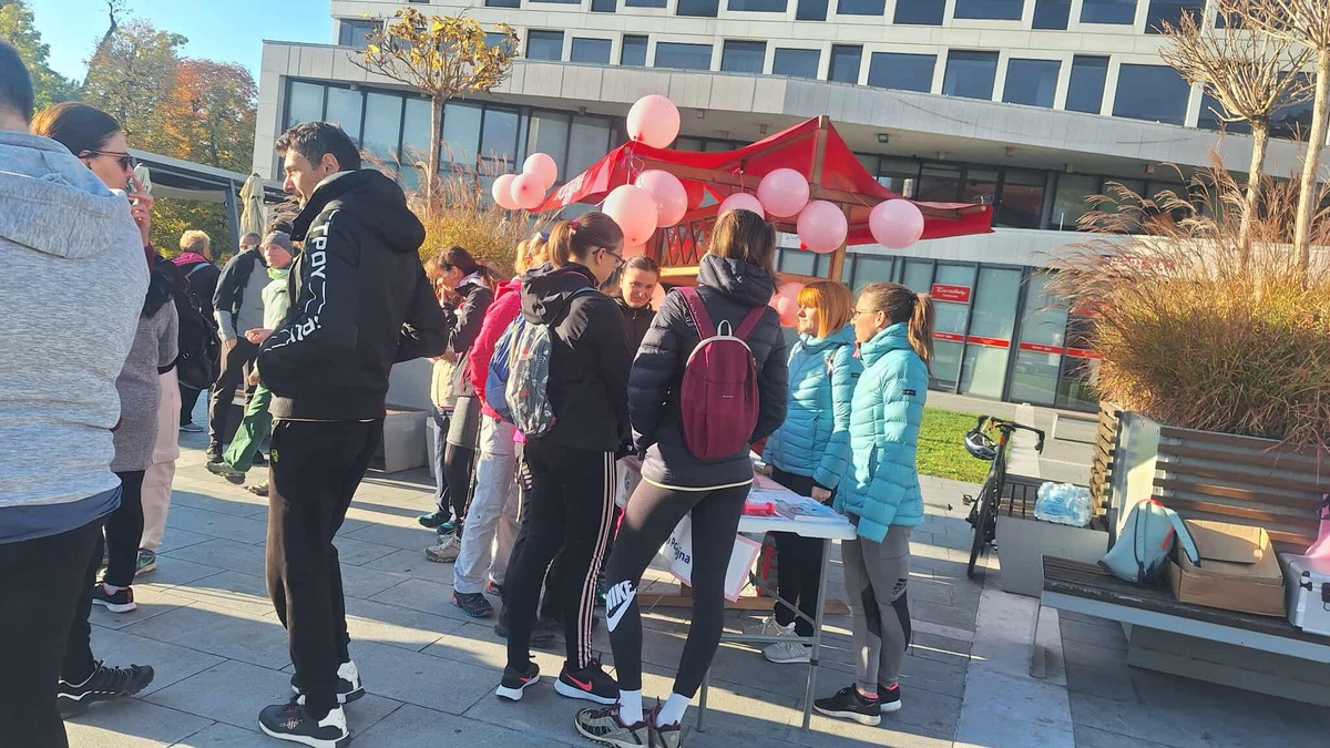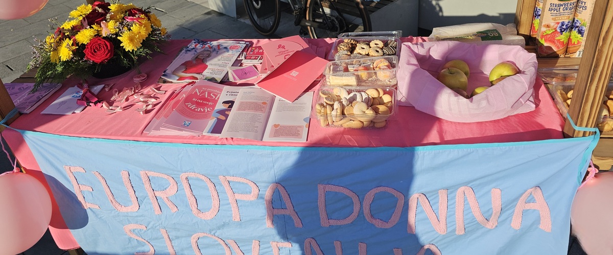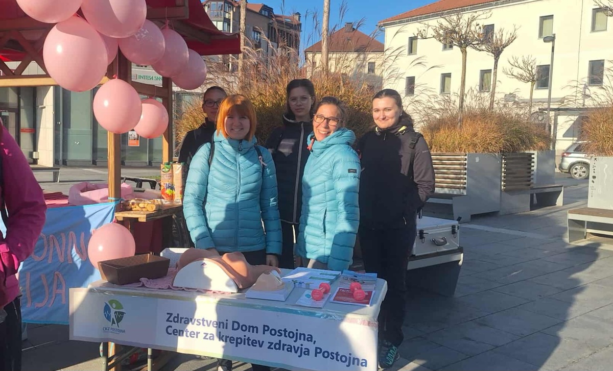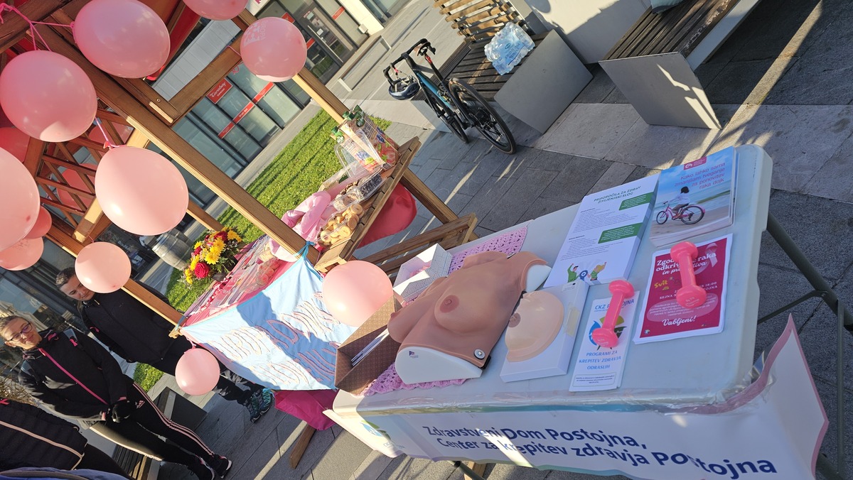 Pred Hotelom Kras sta bili postavljeni stojnici Združenja Europa Donna Slovenija in Centra za krepitev zdravja Postojna, z zanimivim promocijskim materialom in učnim modelom za samopregledovanje dojk.