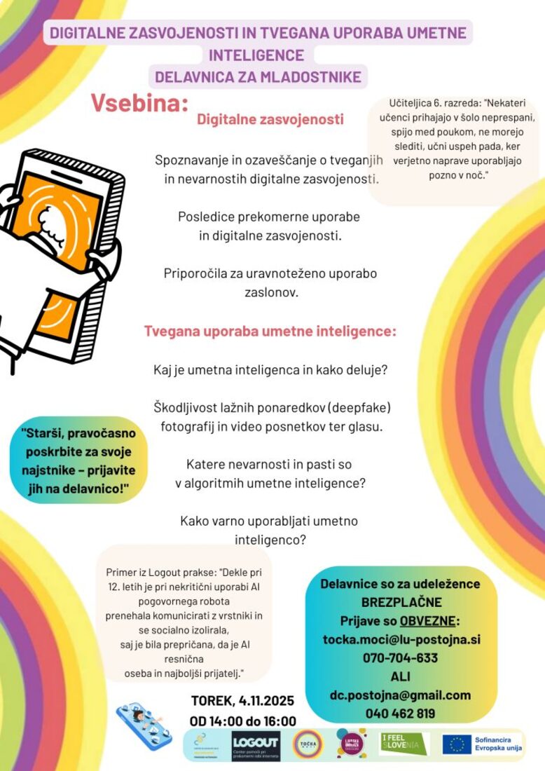 V VGC+ Točki moči Postojna skupaj z Dnevnim centrom Postojna pripravljajo delavnico za mladostnike na temo Digitalne zasvojenosti in tvegana uporaba umetne inteligence. Delavnico bo izvajal LOGOUT, Center pomoči pri prekomerni rabi interneta in sicer v torek, 4. 11. 2025 od 14.00 do 16.00 ure. Delavnica je primerna za osnovnošolce od 9 leta starosti naprej. Obvezne so prijave.