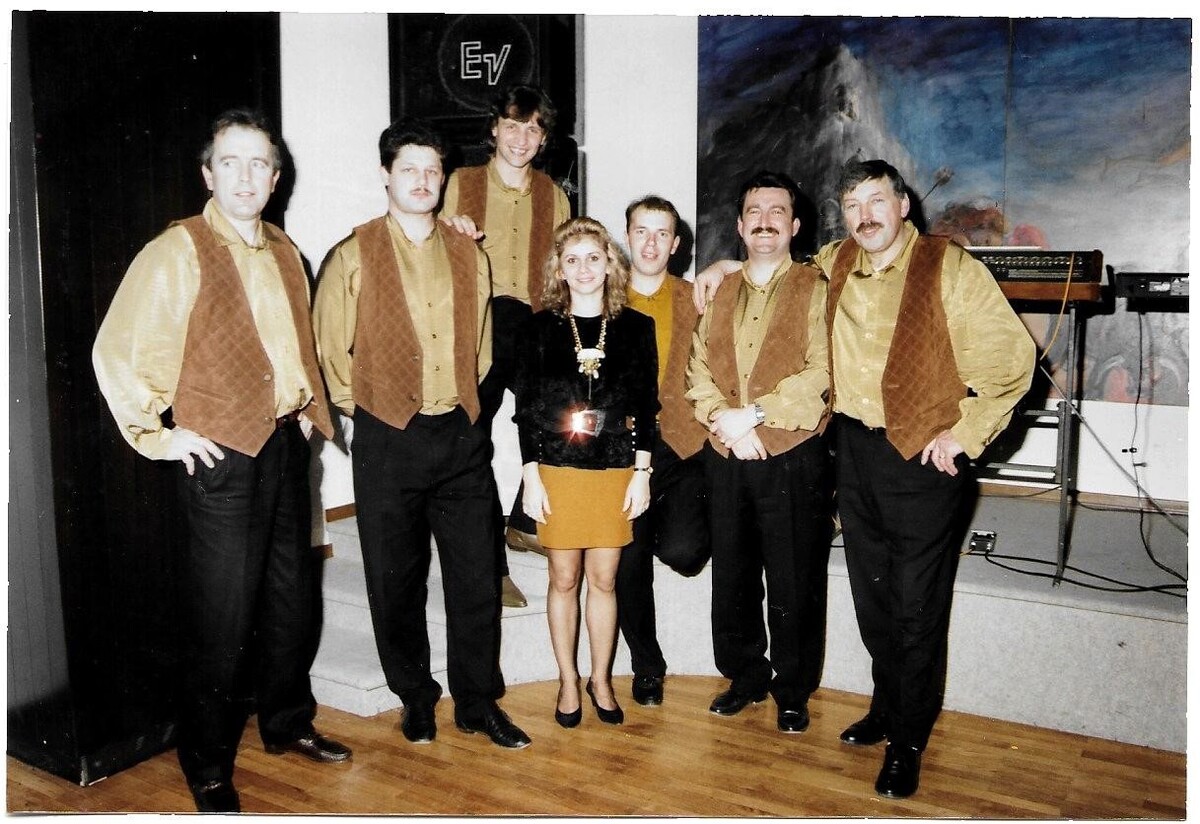 Ansambel Torbarji, prva zasedba: Tomislav, Bojan, Matjaž, Marko, Boris, Nada in Radovan, Foto Žnidaršič Cerknica.