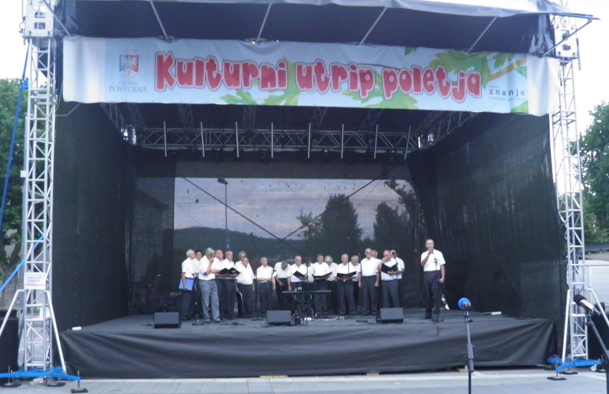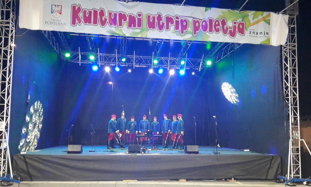 Včerajšnji večer je bil v središču Postojne obarvan s petjem in plesom. Kulturni utrip poletja je na Titov trg pripeljal moški pevski zbor Pivka, folklorno skupino KD Rak Rakek in pevski zbor Dragonarji Generala Maistra.