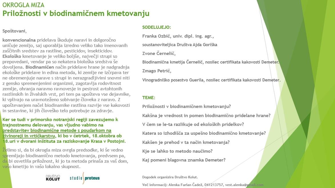 Ker se tudi v primorsko notranjski regiji zavezujemo k trajnostnemu delovanju, vas vljudno vabimo na predstavitev biodinamične metode s poudarkom na živinoreji in vrtičkarstvu, ki bo v četrtek, 18.oktobra ob 18.uri v dvorani Inštituta za raziskovanje Krasa v Postojni.