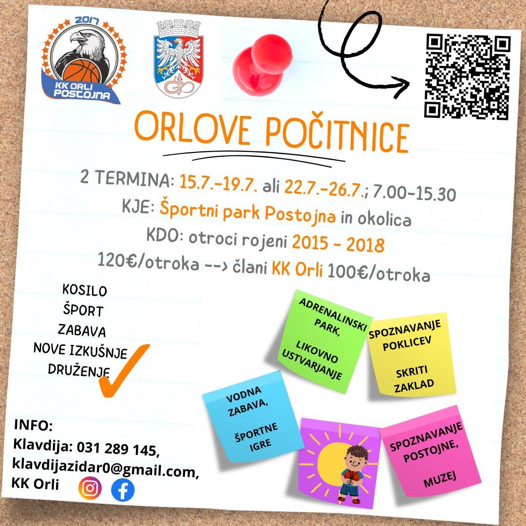 Košarkarski klub Orli Postojna vam ponuja edinstveno priložnost, da vaši otroci preživijo pet nepozabnih dni v okolici Postojne, v družbi strokovno usposobljenih trenerjev. 5-dnevno počitniško varstvo za otroke do 10 let bo potekalo od 15. julija - 19. julija ali 22. julija – 26. julija, 7.00 – 15.30, v Športnem parku Postojna in okolici.