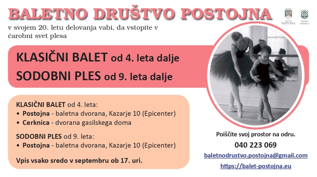 Vabilo k vpisu vadbe klasičnega baleta in sodobnega plesa v Postojni