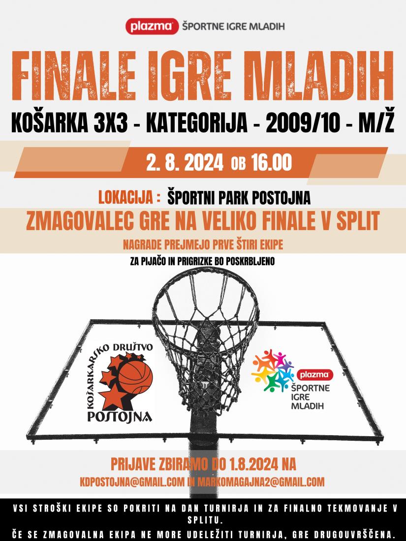 KD Postojna skupaj s Plazma Športnih iger mladih v Postojni organizira drugi kvalifikacijski košarkarski turnir v ulični košarki, ki bo potekal v petek, 2.8.2024 od 16. ure dalje. Turnir je namenjen otrokom (fantom in puncam) letnika 2009 in mlajšim. V ekipi morajo biti 3-4 igralci. Prve štiri ekipe bodo nagrajene, zmagovalni ekipi (fantje in punce) pa bosta odpotovali na regijski zaključek v Split (19.8.-24.8.), kjer bodo sodelovale ekipe s Hrvaške, Srbije in Bosne in Hercegovine. Sodelovanje, tako na turnirju v Postojni, kot tudi na zaključku v Splitu, je brezplačno. Prijave zbiramo na kdpostojna@gmail.com ali na 030 711 422 (Marko) ali preko spletne prijave najkasneje do četrtka, 1.8.2024, do 16. ure.